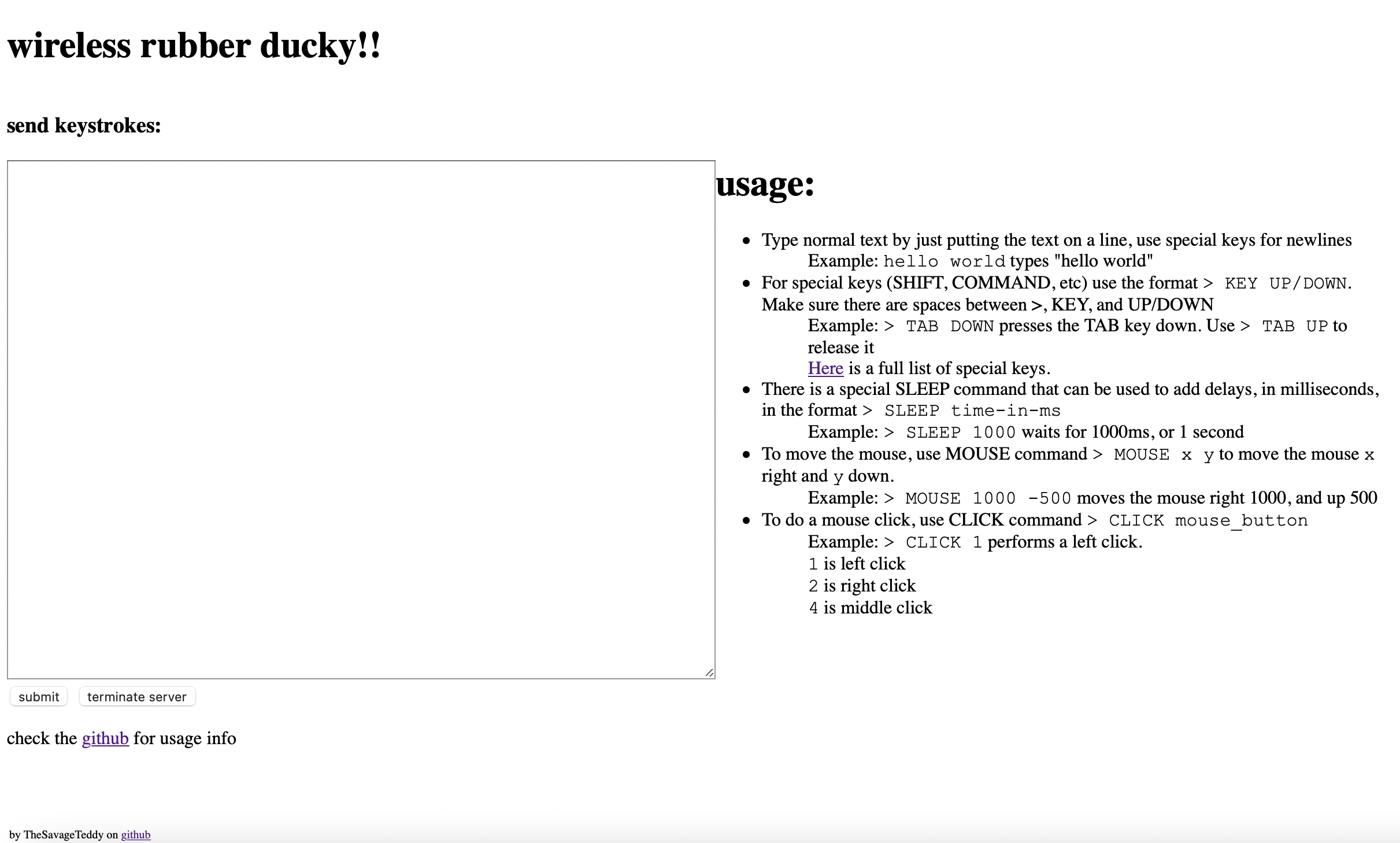 A rubber ducky emulates a keyboard/mouse, sending keystrokes to the target computer. With this repo you can make your own using a Raspberry Pico W for just $6, and connect to it over Wifi, as it hosts a webserver where you can input commands to run and send keystrokes!