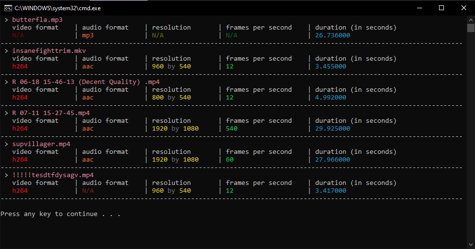 Grabs the video/audio format, resolution, framerate, duration, and (optionally) the frame count from all input videos and lists them.