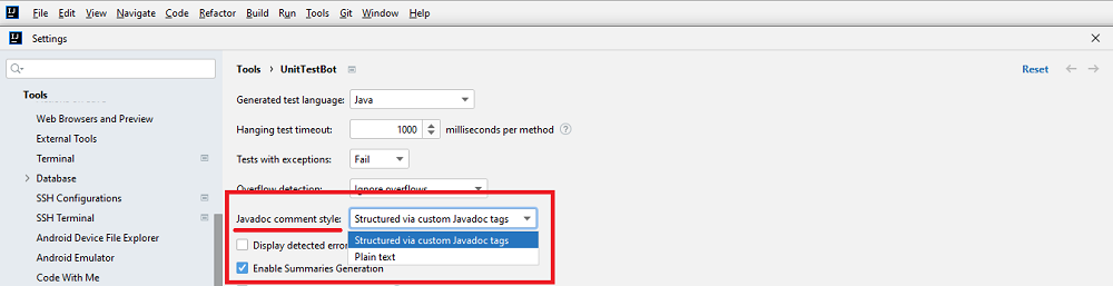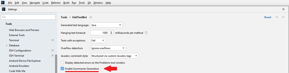 Go to File > Settings > Tools > UnitTestBot and choose to generate summaries if you want UnitTestBot to provide you with detailed test descriptions — see how to Read test descriptions for more information. You can also choose the style for them.