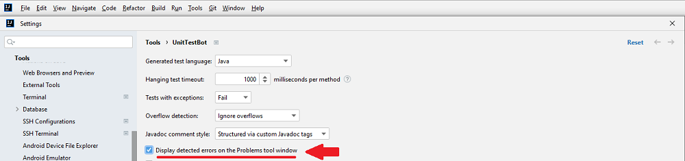 Go to File > Settings > Tools > UnitTestBot and choose to Display detected errors on the Problems tool window if you want your IntelliJ IDEA to automatically show you errors, registered in the SARIF report during test generation.