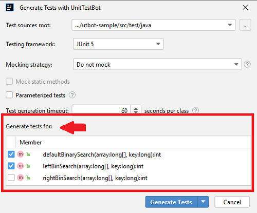 Then in the Generate Tests with UnitTestBot window tick the classes or methods you'd like to cover with tests.
