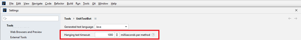 Go to File > Settings > Tools > UnitTestBot and set timeout in milliseconds — at 50 milliseconds intervals.