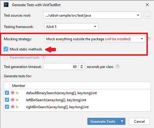 In the Generate Tests with UnitTestBot window choose your Mocking strategy: