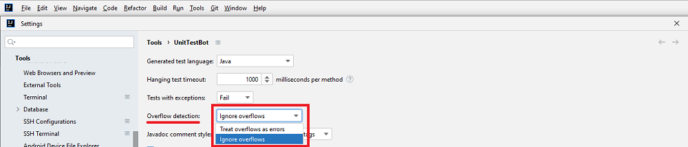 Go to File > Settings > Tools > UnitTestBot and choose the approach to overflows: whether UnitTestBot should Ignore overflows or Treat overflows as errors.