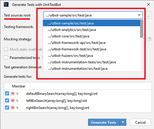 For your first test generation with UnitTestBot choose the Test sources root manually in the Generate Tests with UnitTestBot window. UnitTestBot will remember your choice for future generations.