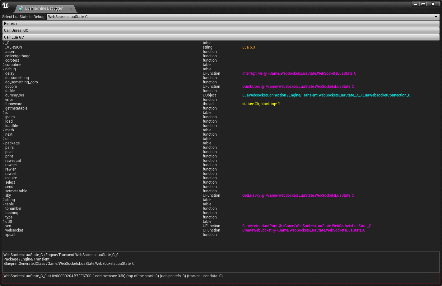 You can control/monitor active LuaStates as well as triggering both Unreal and Lua GC's