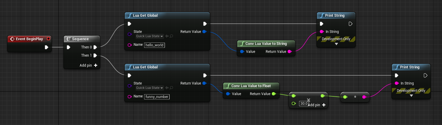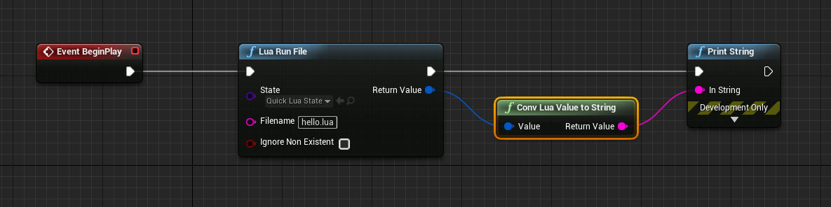 The LuaRunFile node will execute a lua file (relative to the Content/ directory) in the specified LuaState (QuickLuaState in our case) and will return the value returned by the script itself as a LuaValue UStruct. The plugin offers a bunch of operations you can apply to LuaValue's, in this example we simply converted the value to an Unreal String.