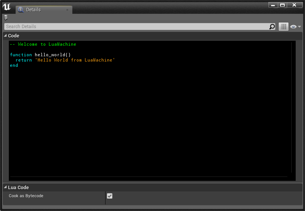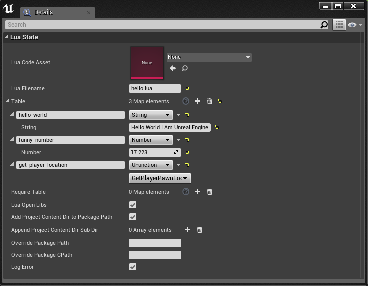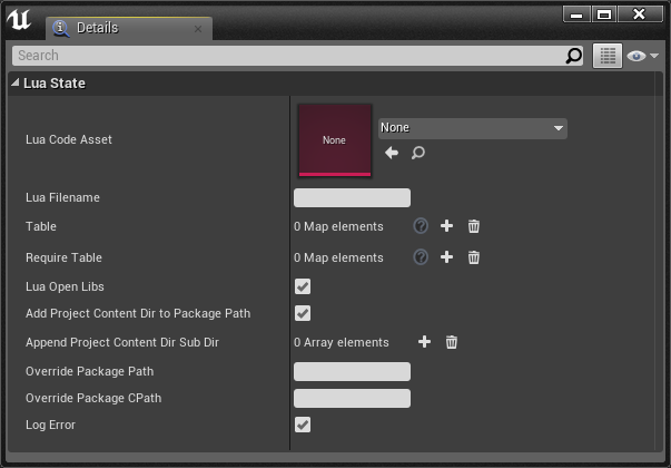 Open the QuickLuaState Blueprint you created before. This Blueprint exposes lot of different fields to configure your Lua Virtual Machine: