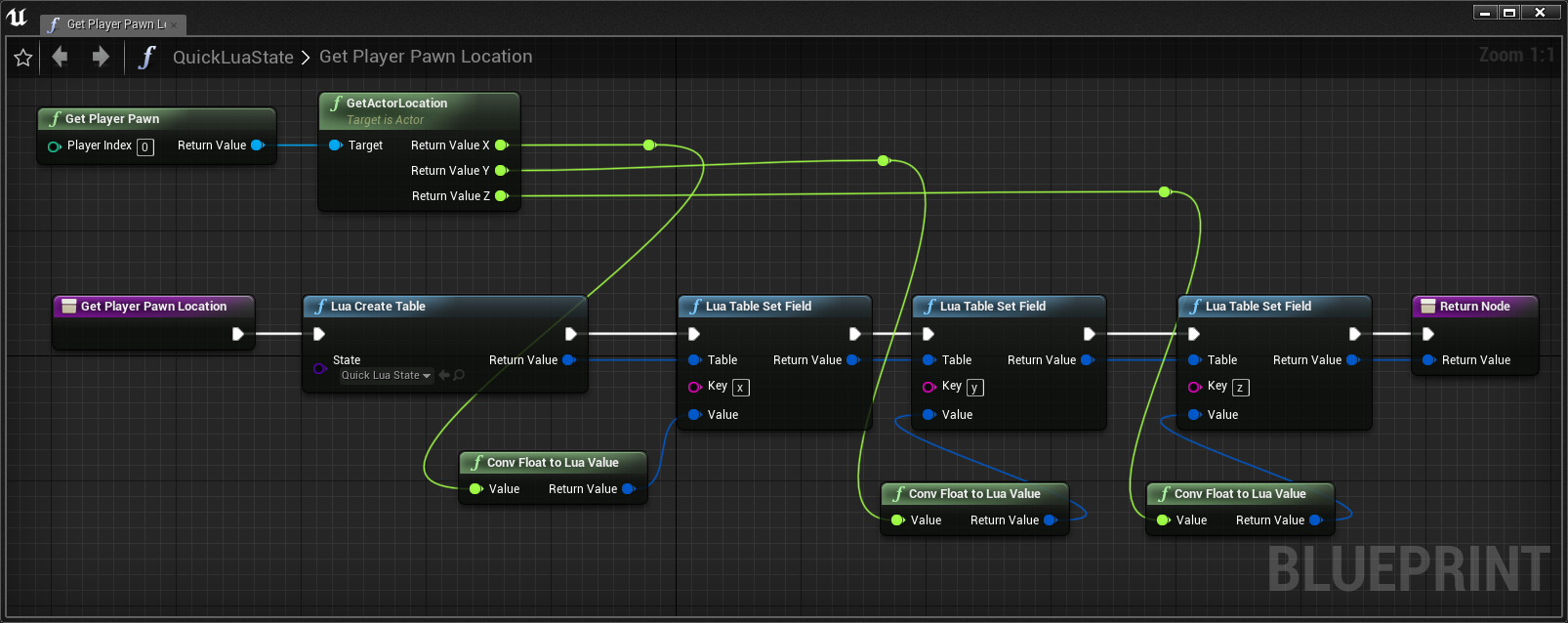 calling get_player_location() from lua, will trigger the QuickLuaState's GetPlayerPawnLocation(). Note that not all of the UFunction's can be exposed: if they take or return values they must be LuaValue's