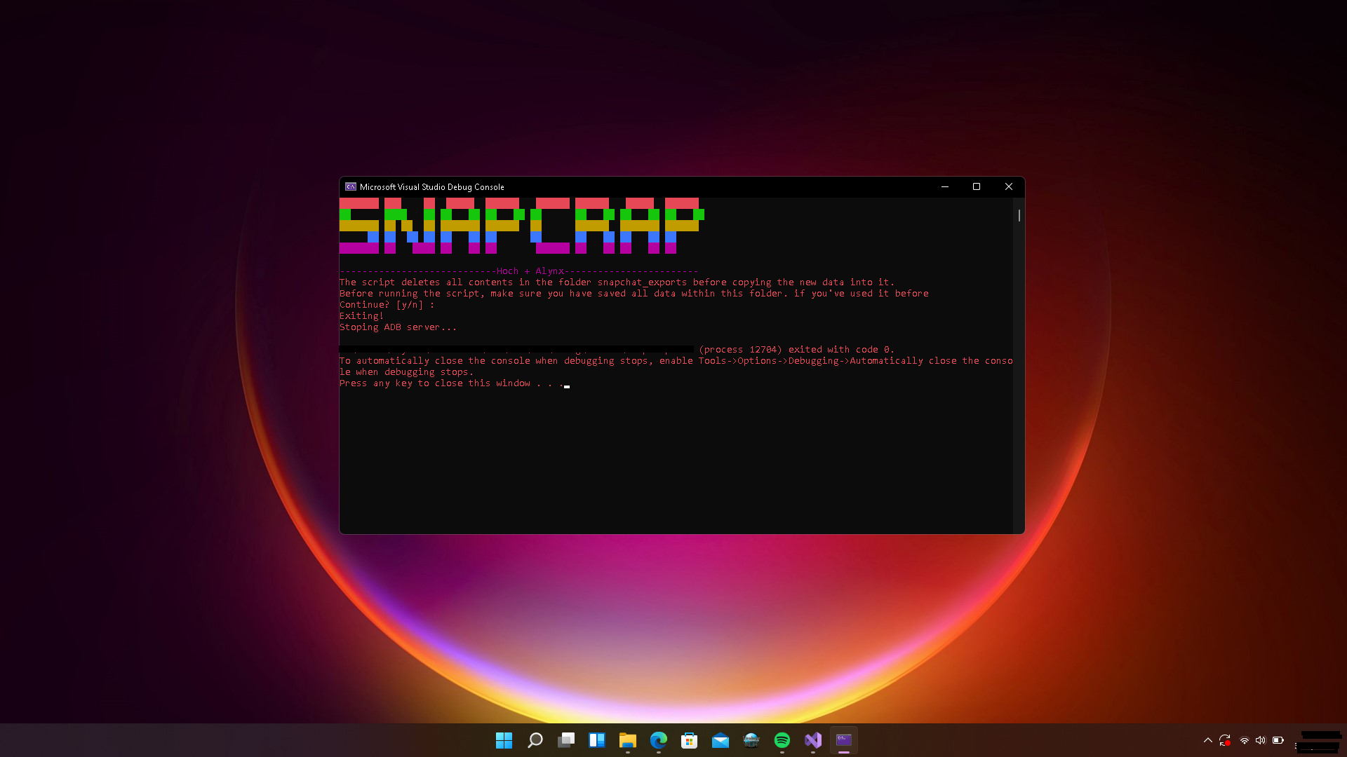 6. Run the program again. When it finishes, you will find the result on your phone in a folder named snapchat_exports.