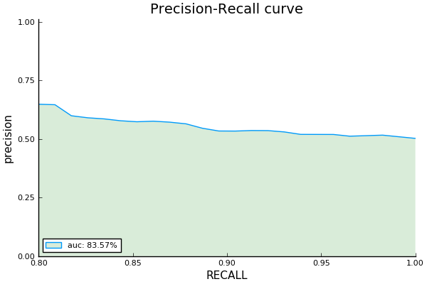 julia> prplot(targets, scores; xguide="RECALL", fill=:green, grid=false, xlims=(0.8, 1.0))