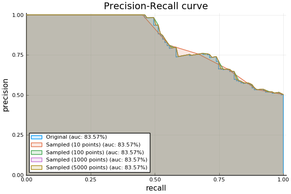 julia> prplot!(targets, scores; npoints=5000, label="Sampled (5000 points)")