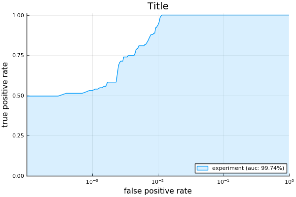julia> rocplot(targets, scores, title="Title", label="experiment", xscale=:log10)