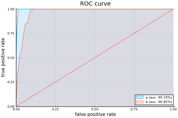 julia> rocplot([targets, targets], [scores, scores .+ rand(10000) ./ 5], label=["a" "b";])