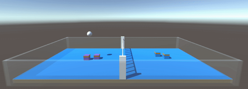 VolleyballMainscene (Project panel → Assets → Scenes →VolleyballMain.unity). - Click the ▶ button at the top of the window. This will run the agent in inference mode using the provided baseline model.