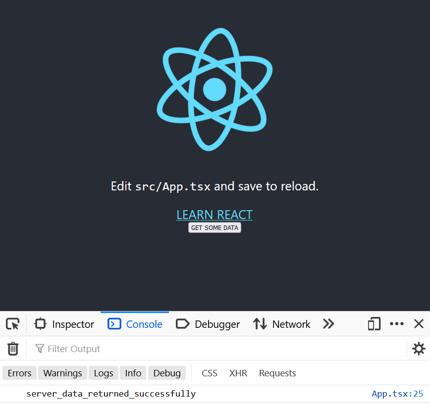 Open up the App.tsx file in the src directory of the project generated by create-react-app. We are going to add a simple button that uses the browser fetch API to grab the data from our server and log it to the console.