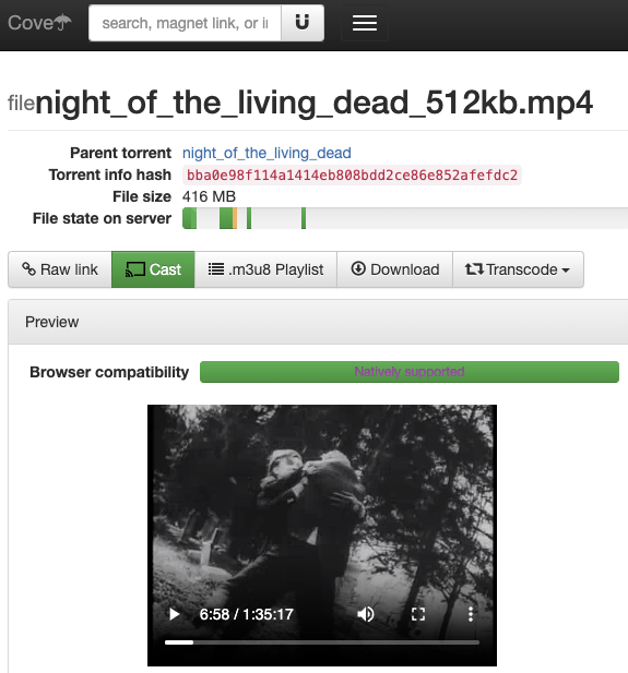 cove is a self-hosted torrent browser that bundles a BitTorrent client, DHT indexer, and a web UI on your device. It provides additional functionality like automatic transcoding of resources for browsers and Chromecast. cove requires no external servers. The search capabilities, streaming, transcoding and other features are operated entirely on your device.