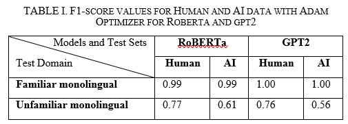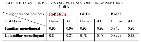 Notably, RoBERTa fine-tuned with LoRA achieved an F1-score of 0.96 on AI-generated content in the familiar domain, while BART with LoRA performed best in the unfamiliar domain with an F1-score of 0.88, demonstrating strong generalization and adaptability across varying contexts.
