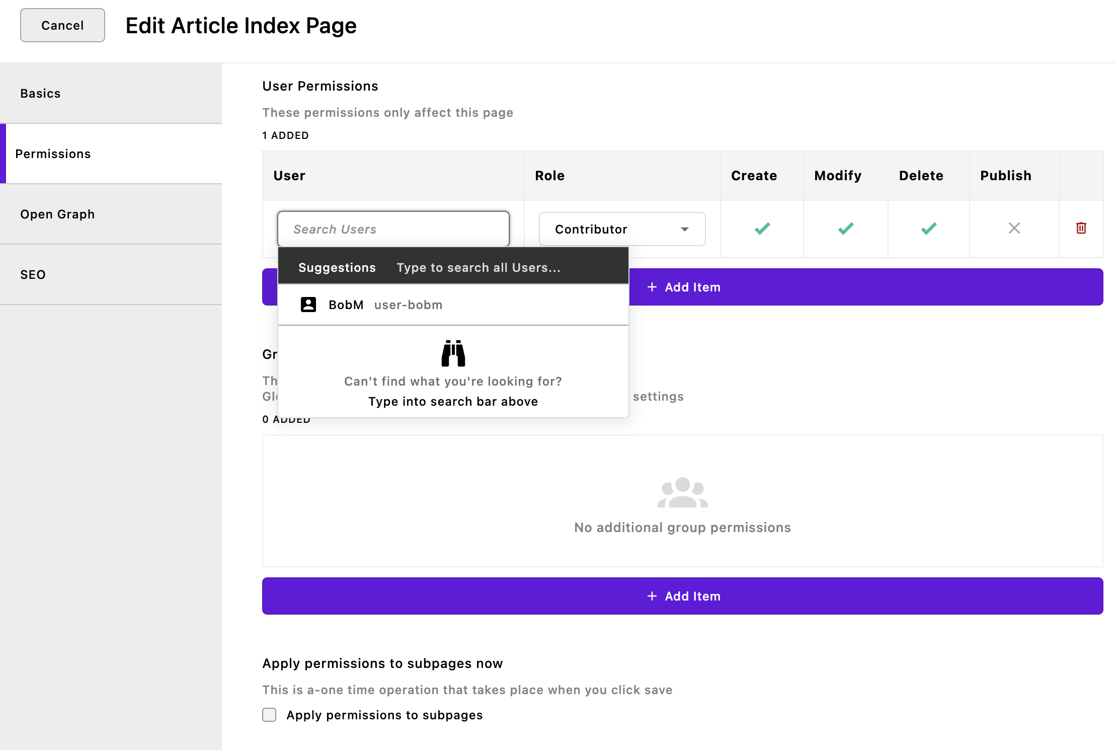 @apostrophecms-pro/advanced-permissionmodule. Permissions are more granular with the ability to modify the permissions of the individual page and piece documents. Permissions can easily be set for users or groups on each document. You can also easily duplicate permissions between parent and sub-pages.In developing this module, we also improved the core