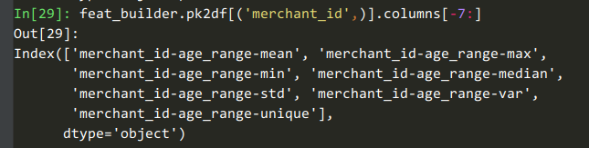 该构造器的设计哲学是以主键为核心构建与主键相关的特征列。如本赛题中,训练数据的主键为user_id, merchant_id,那么我们就可以构造出user_id, merchant_id, user_id, merchant_id 这三个特征表。