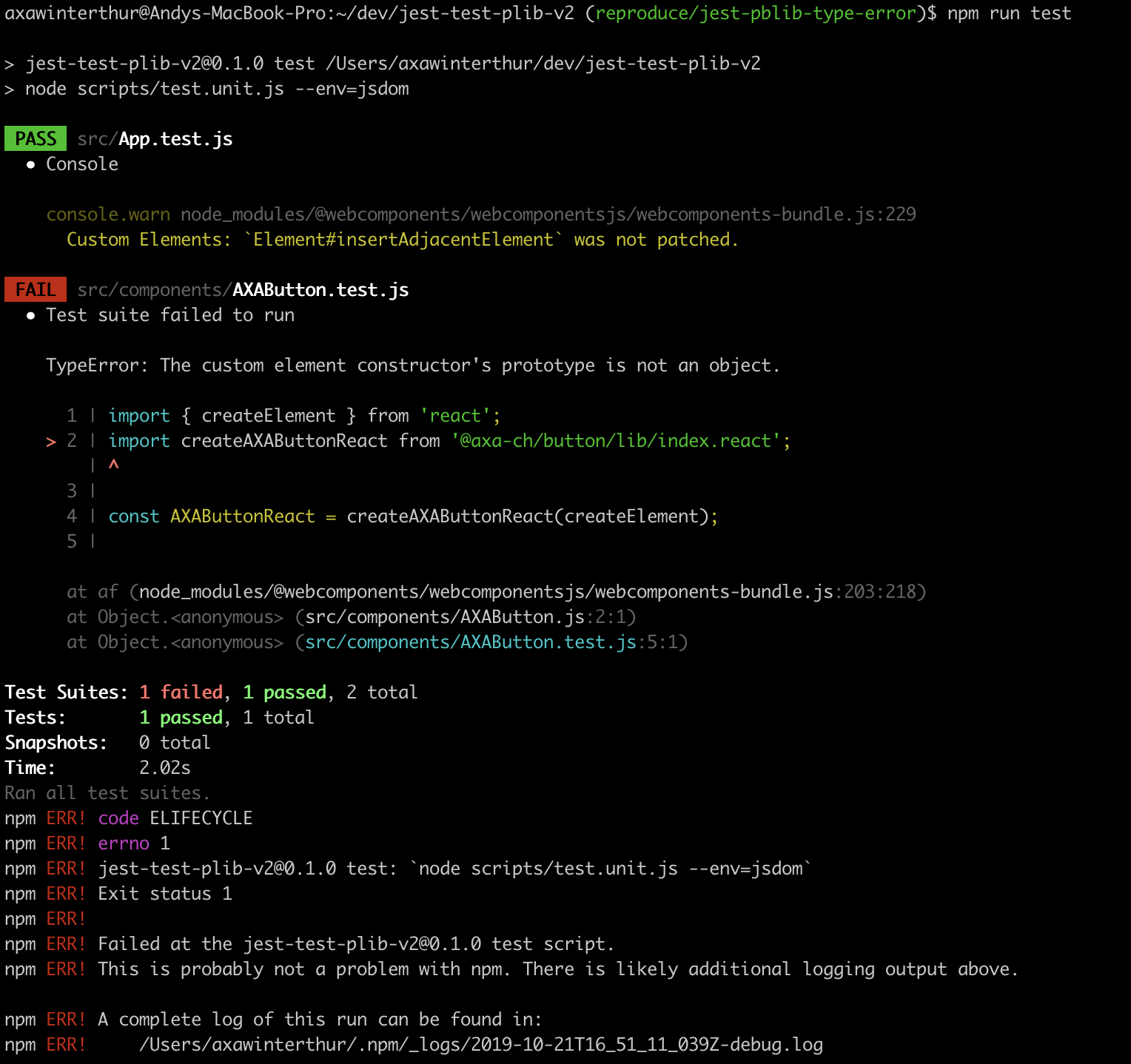 npx create-react-app foo, using reactified@axa-ch/buttonand writing a shallow test for it throws TypeError: The custom element constructor's prototype is not an object.Related source code of