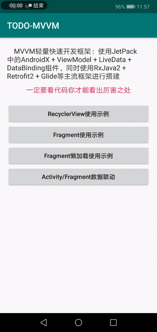 目录 介绍 Demo下载体验 项目编译 使用步骤 QQ交流群 介绍: MVVM轻量快速开发框架:使用JetPack中的AndroidX + ViewModel + LiveData + ViewBinding,同时使用ViewPager2 + RxJava3 + Retrofit2 + Glide等主流框架进行搭建 Demo下载体验 点击下载:TODO-MVVM 使用步骤 下载本项目,在你的项目中点击File —> New -> Import Module...然后选择basicLib;然后在你的项目中依赖basicLib wait a moment ... QQ交流群