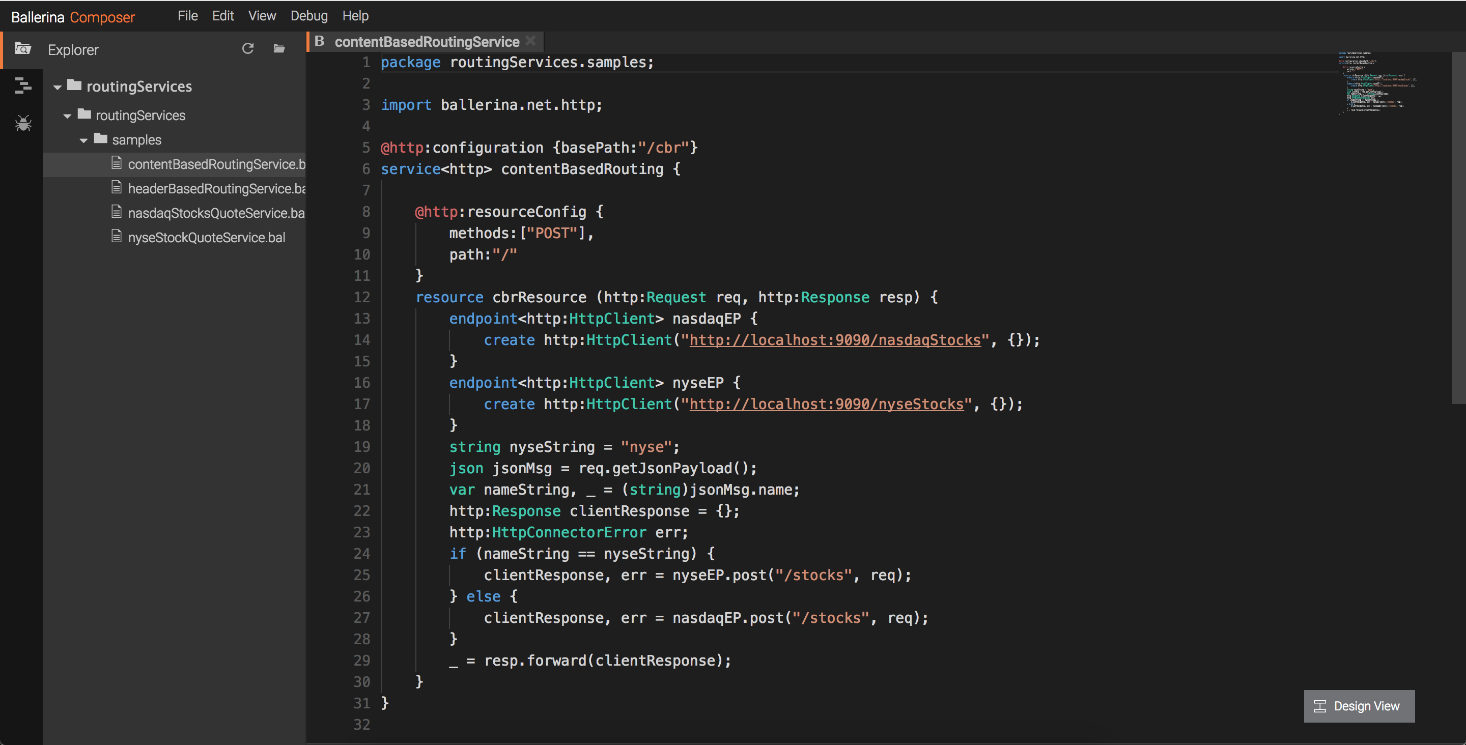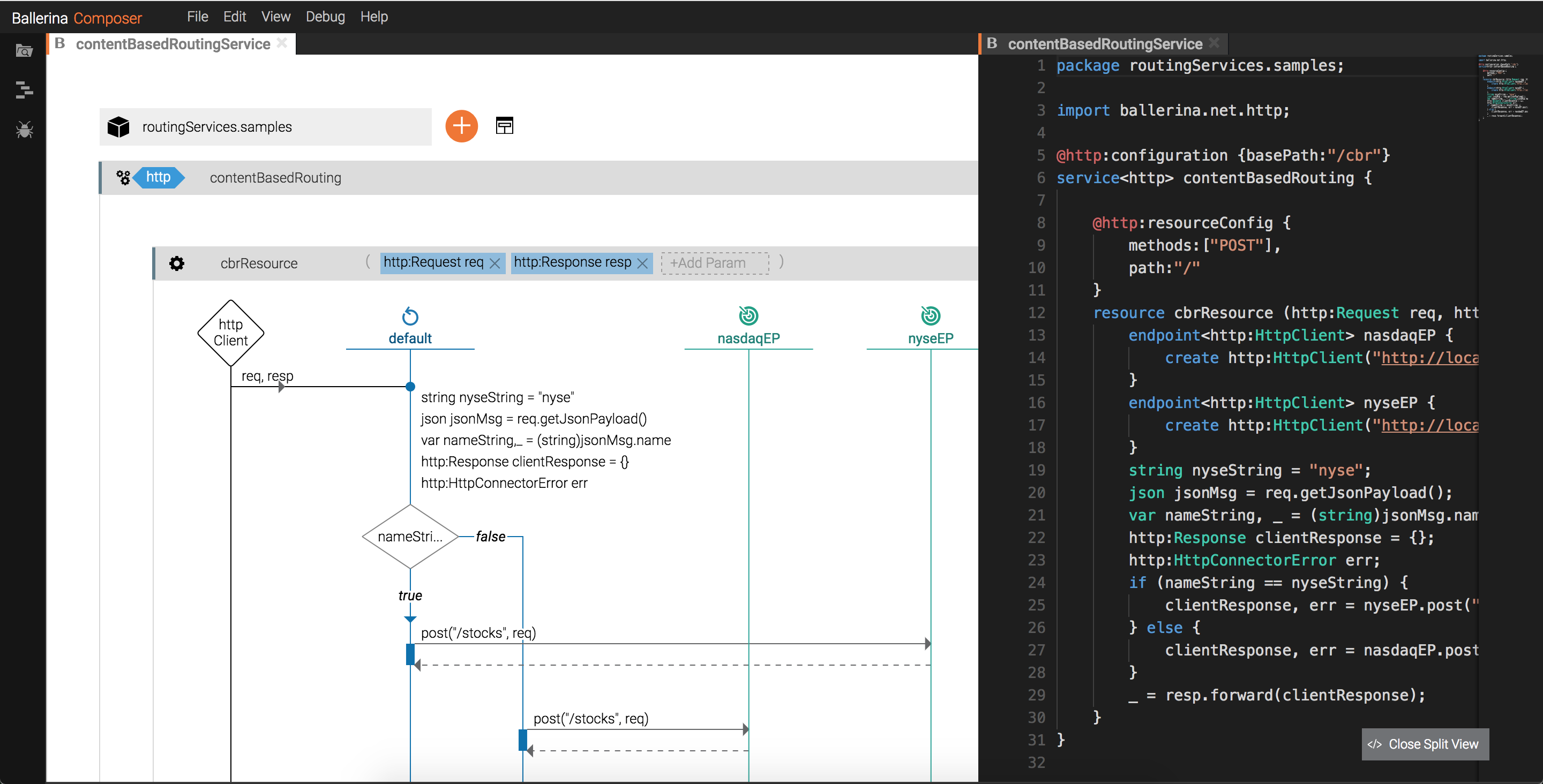 The Ballerina Composer provides a flexible and powerful browser-based tool for creating your Ballerina programs. You can build your integrations by creating sequence diagrams, dragging elements from a tool palette onto a canvas. As you build the diagrams, the underlying code is written for you, which you can work with in the Source view. You can also use the Swagger view of a Service and writing Swagger definitions. You can switch seamlessly between the Design view, Source view and create your programs in the way that you like to work.