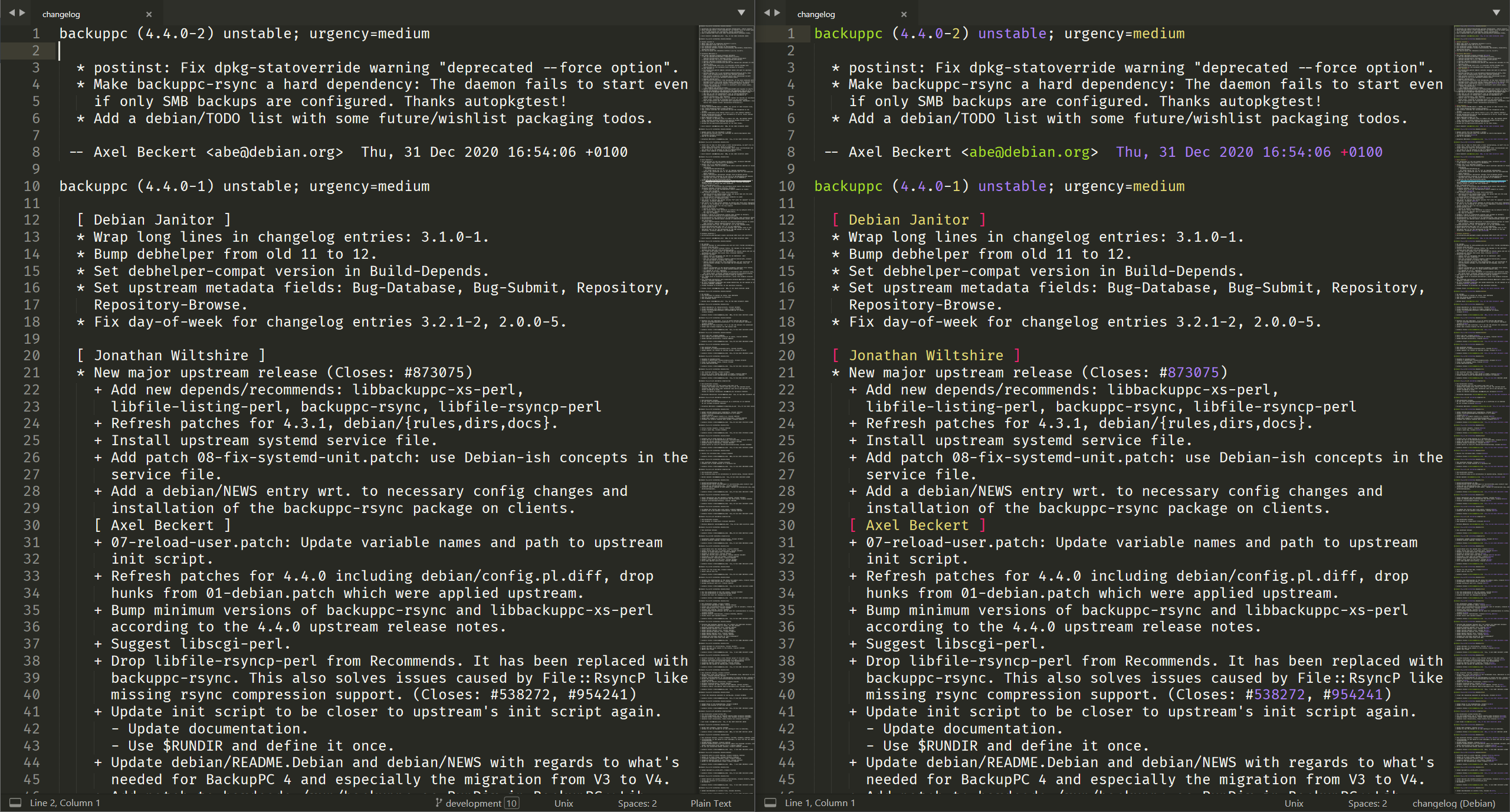 Debian changelog, control and copyright files with Sublime Text 3's default Monokai color scheme: