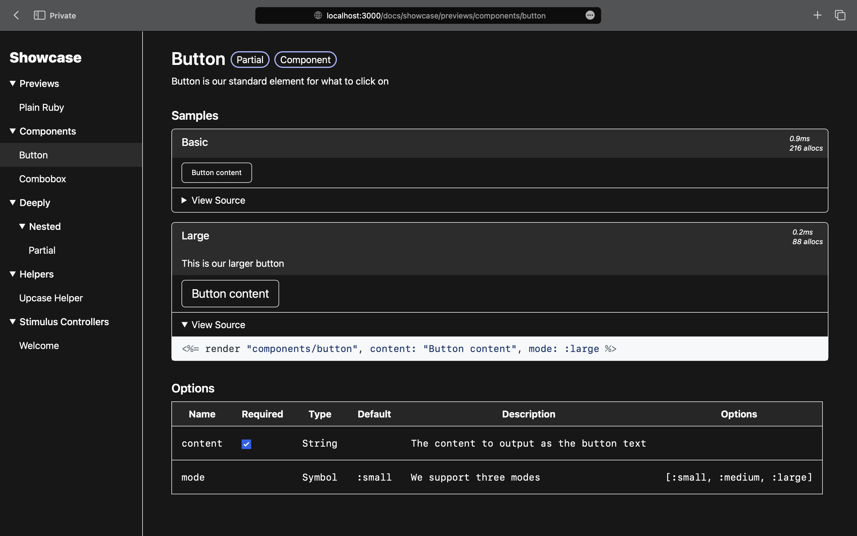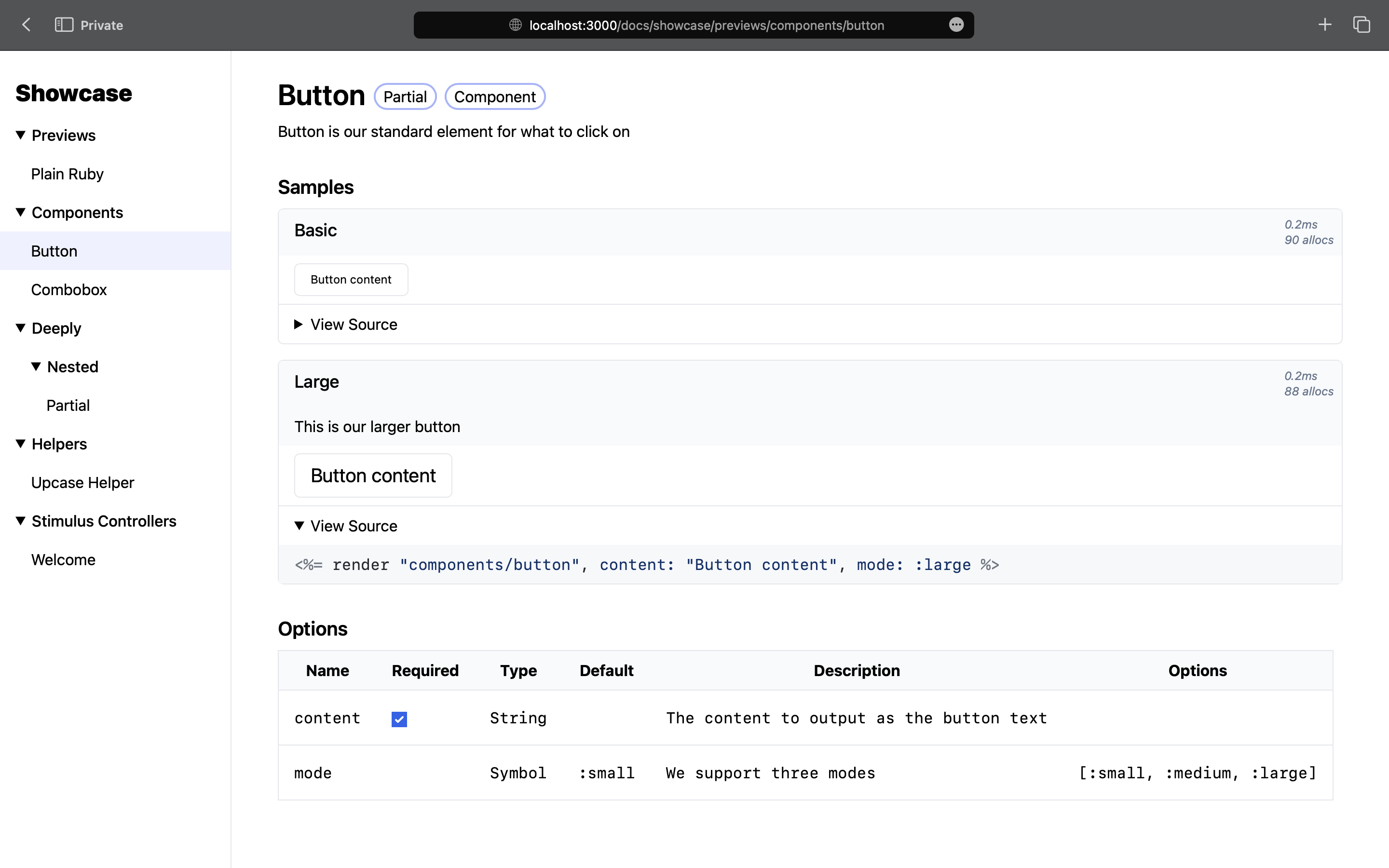 Here's how to showcase a standard button component written with standard Rails partials: