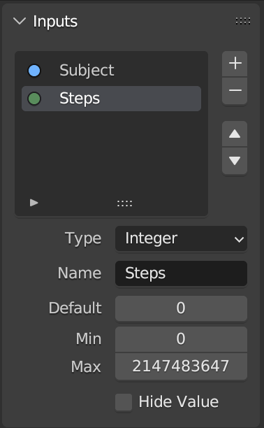 Provides access to the input values for the node tree. Configure the inputs in the sidebar. Values can be provided to the inputs from the Render Properties panel.