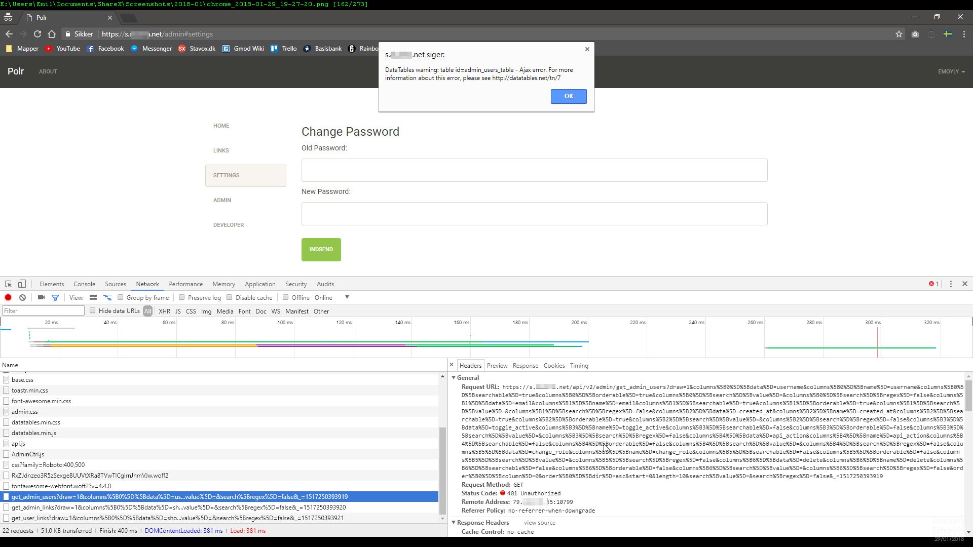 It throws this error: datatables warning: table id=admin_links_table - Ajax error. For more information about this error, please see http://datatables.net/tn/7