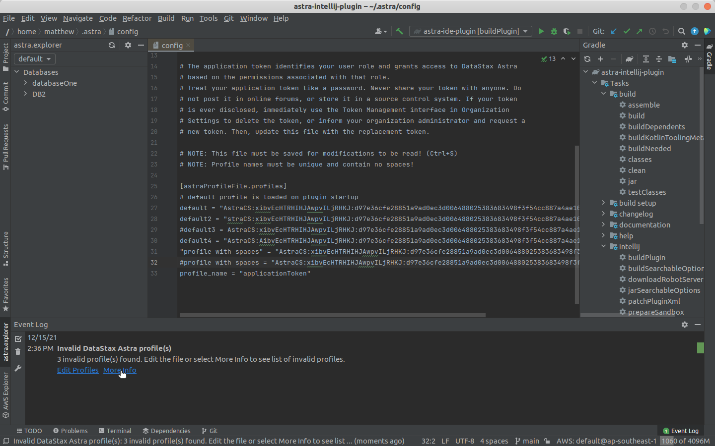 If the plugin loads the config file and finds any invalid tokens associated with profiles it displays a notification error to alert the user. In this notification is the option to view more info about the error.