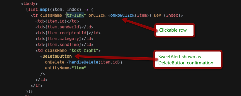 The code consists of a table with clickables TRs and a DeleteButton: