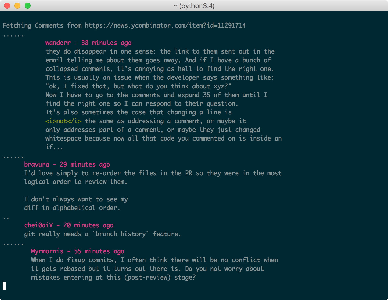 The HTML contents of the post's link are formatted for easy-viewing within your terminal. If available, the formatted output is sent to a pager.