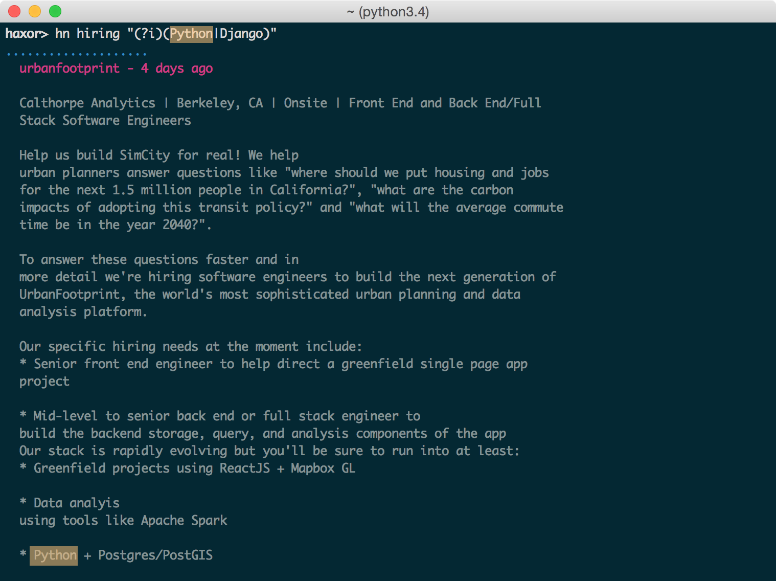 $ hn hiring "(?i)(Node|JavaScript).*(remote)" > remote_jobs.txt