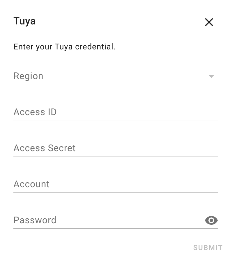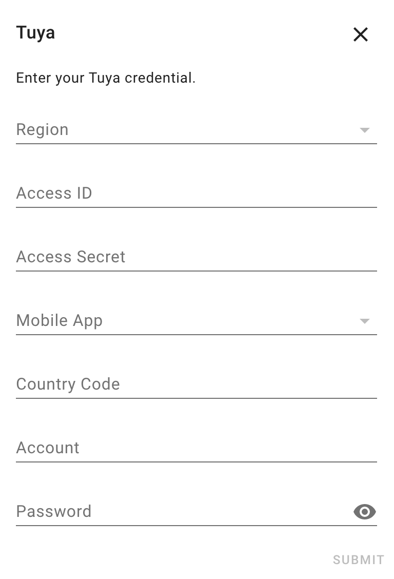 | Mobile App | Must select the one you used to link devices on the Tuya IoT Platform. |