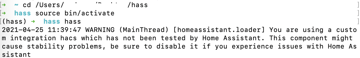 Go to the home assistant installation folder ~/hass and use the following command to activate it and run the hass service: