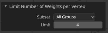 - Click on the menu Weights -> Limit Total. A small panel will appear in the bottom of the editor, ensure the limit is set to 4:
