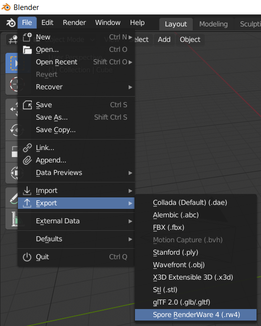 To export the current scene into a .rw4 file, which is what Spore uses for models, use the button File -> Export -> Spore RenderWare4 (.rw4)