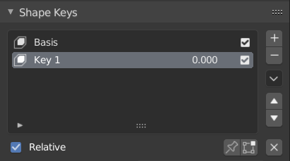 There is a subpanel there called Shape Keys. Click on the + button to add the basis shape key, which represents the undeformed model. Add another one for every version of the model you are going to use; for example, I will add another one that makes the teeth bigger. Important: ensure the box Relative is selected: