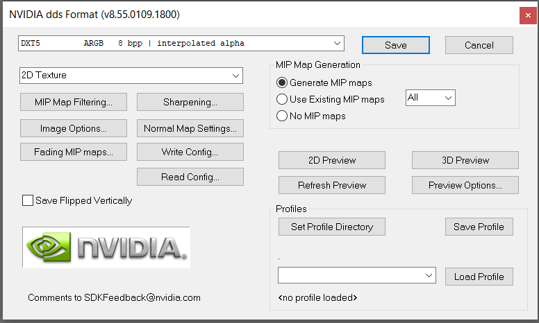 In order to be able to load and save DDS textures in Photoshop, you will need to download and install the NVIDIA Texture Tools for Adobe Photoshop.