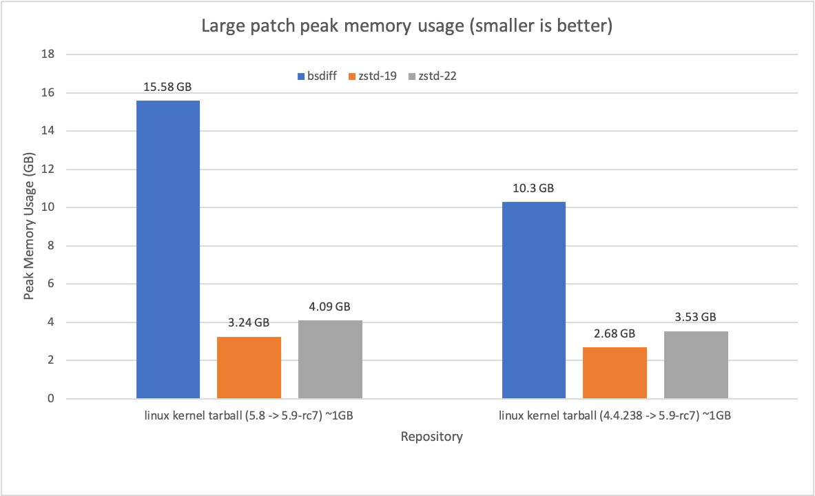 In terms of memory footprint, level 19 --patch-from also significantly outperforms bsdiff.