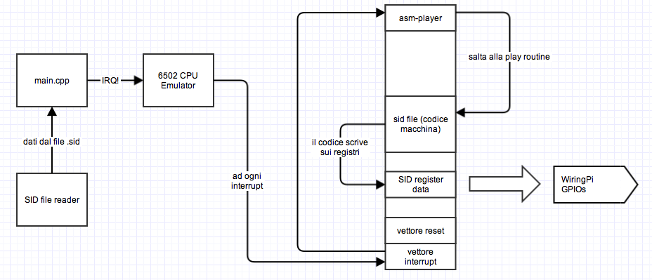 Altre componenti sono il parser per i file .sid e la libreria WiringPi per pilotare i GPIO del RaspberryPi.