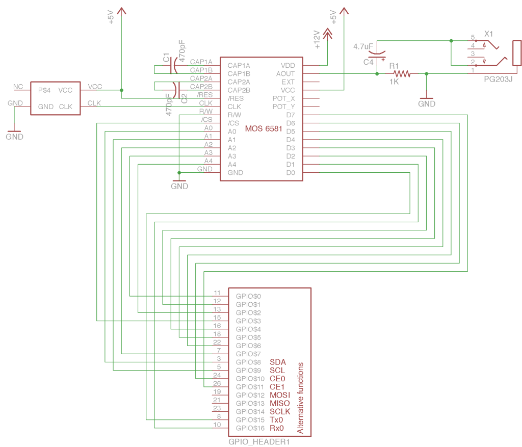 NOTA IMPORTANTE!: Il RasberryPi ragiona in logica CMOS a 3.3V mentre il SID chip è TTL a 5V quindi completamente incompatibili a livello di tensioni. Fortunatamente, siccome andiamo unicamente a scrivere nei registri, il RasberryPi dovrà soltanto applicare 3.3v ai capi del chip, più che sufficienti per essere interpretati come livello logico alto dal SID.