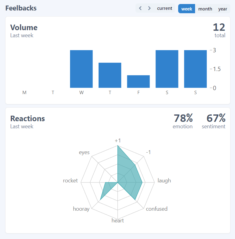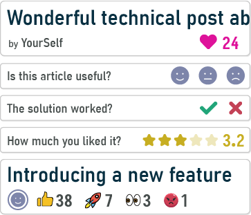 Feelback is a service allowing to collect any type of feedback for your content, such as likes, reactions, ratings, suggestions, error reporting and so on. It integrates easily with any website with prebuilt components.