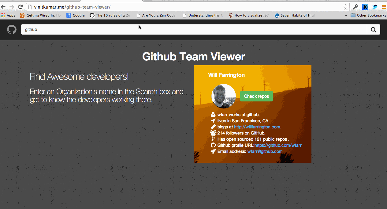 Github Team Viewer is a handy application built with Angular.js which helps you find developers from any organization on github. In order to use it just enter company name in the search bar and you will get a list of developers.