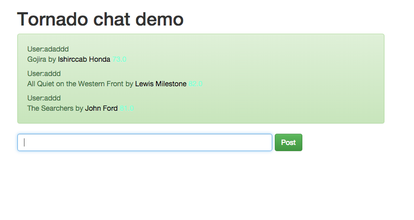 This is a small chat bot built to play with Tornado. The chatbot uses random movie titles