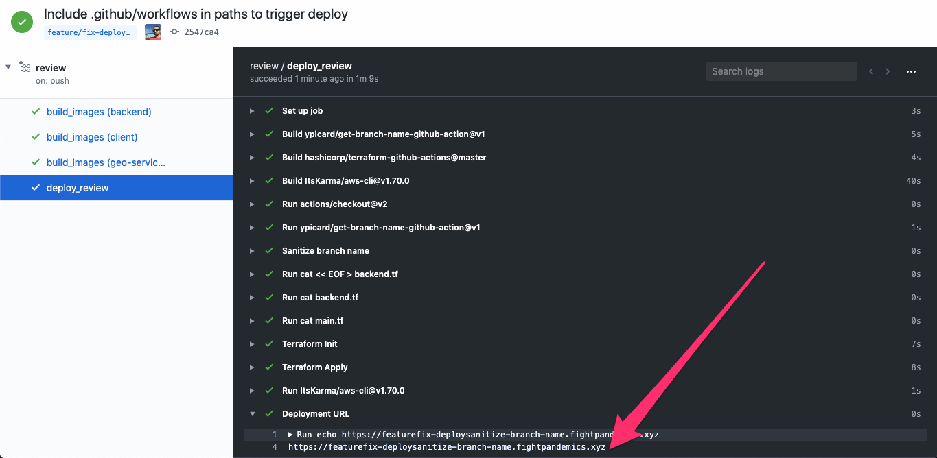 Every time you push code up to the repository, a build based off of your feature review branch will be deployed to AWS. Note that in order for a build to run, the branch name must have the feature/ prefix. You can view the build logs in GitHub Actions. After the build successfully completes, you can view the URL to which your app was deployed by clicking on the "Deployment URL" step in the deploy_review job in the workflow run for your build: