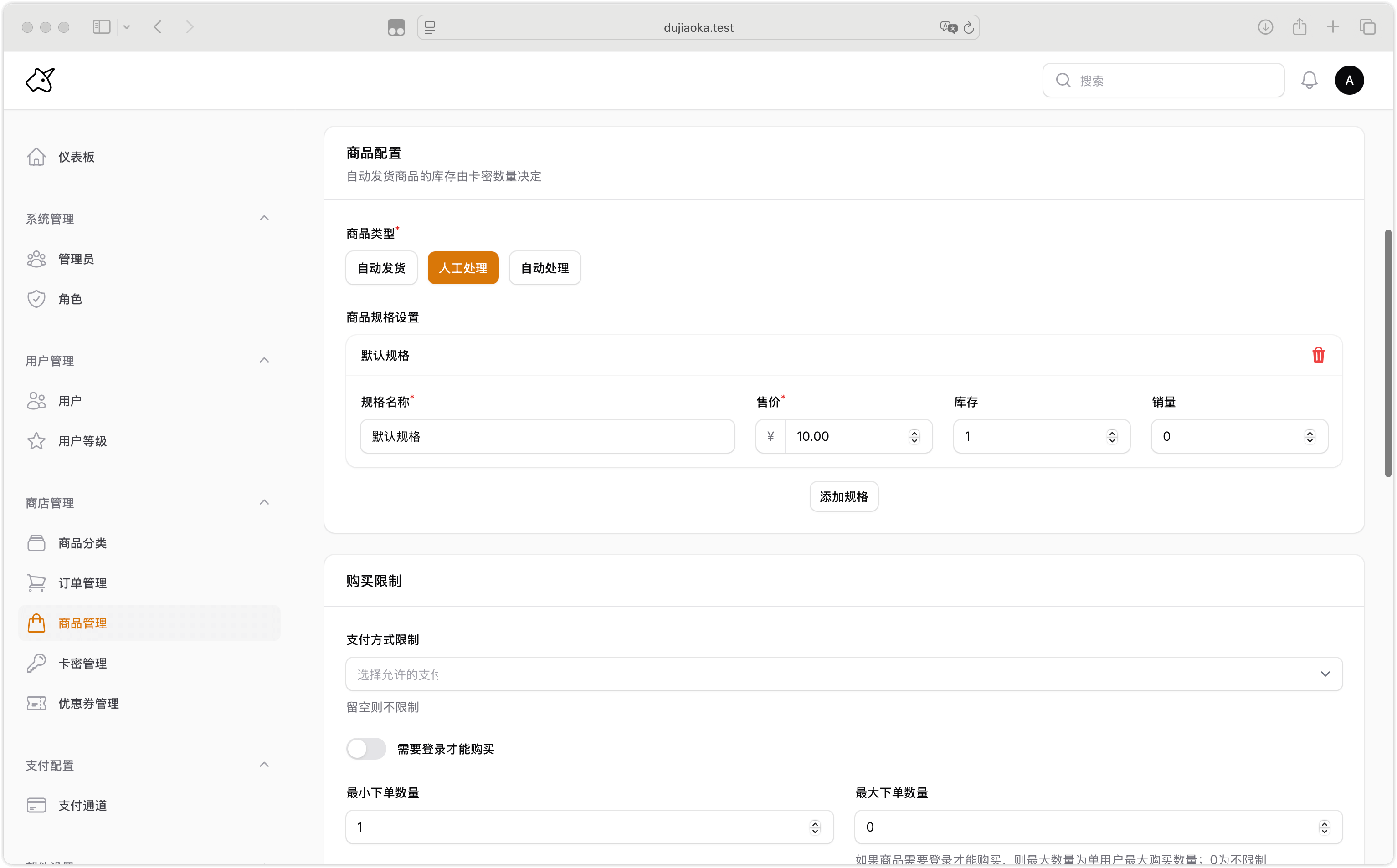 - 单商品支付方式限制