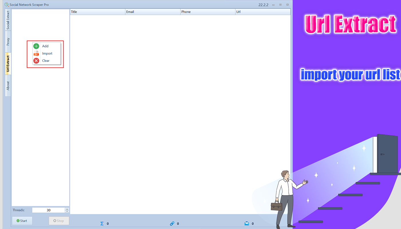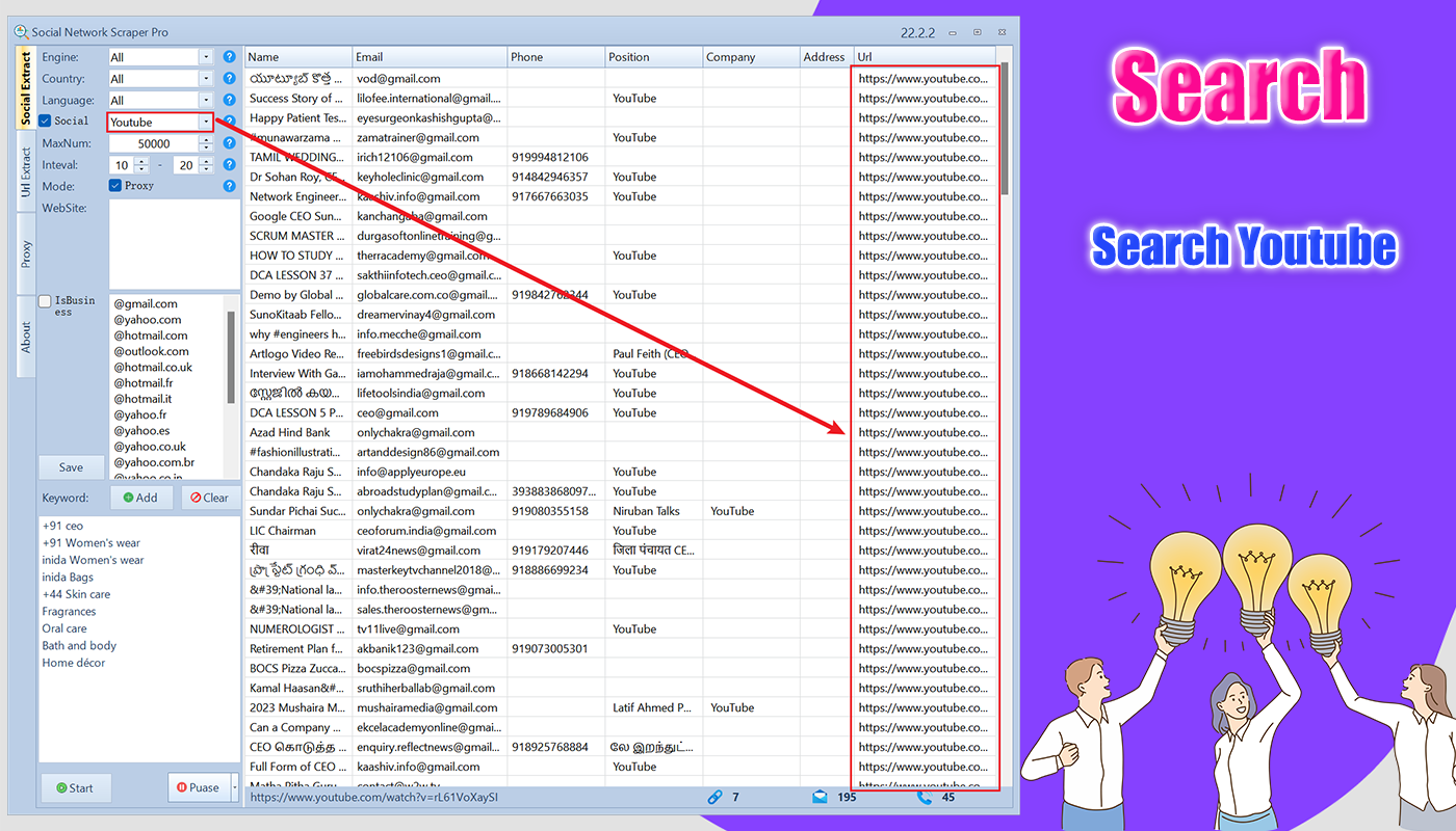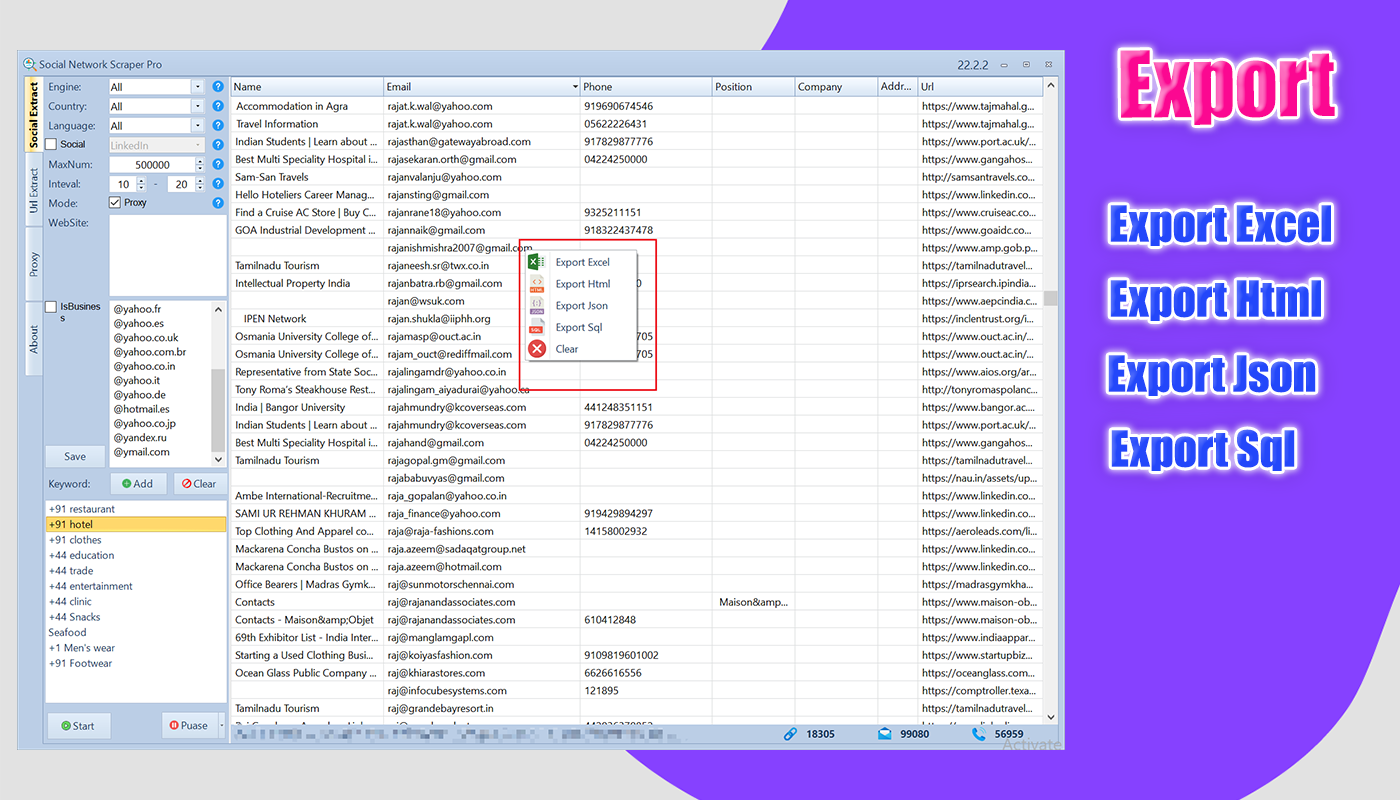 Social Network Data Scraper Pro is a powerful tool that allows you to bulk extract email and phone numbers from various social media platforms including Facebook, Twitter, Instagram, LinkedIn,Youtube,Pinterest,TikTok,tumblr and any website. Support for proxy features that allow you to extract data from any website without any blocking, you can easily collect contact information of potential customers and use it for your marketing and sales efforts.